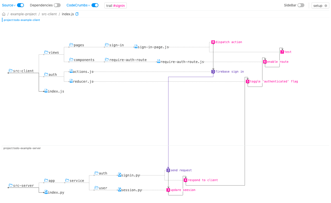 E.g. for client-server application, go to the source directory for your server code and run codecrumbs -e your-server-src/index.py -d your-server-src, same for client codecrumbs -e src-client/index.js -d src-client.