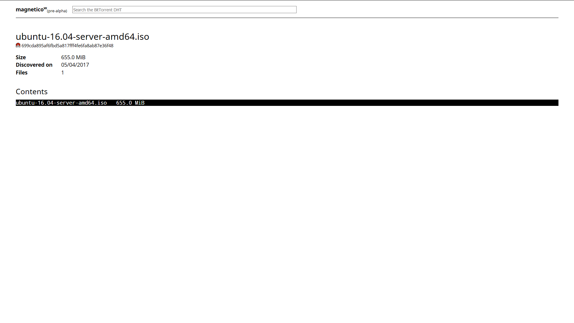 magnetico is the finishing move that allows users to search for torrents in the network, hence removing the need for centralised torrent websites.